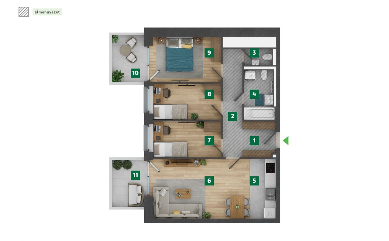 * Eladható terület definíciója: a lakás eladható területe – a kiviteli terv szerint - a lakás helyiségeinek a vakolatlan, burkolatlan falak, illetve pillérek között 1 méter magasságban mért távolság alapul vételével meghatározott (az egy méter magasság alatt található előtétfalak területét és a mögöttük lévő területet, az ajtók és szabad nyílások alatti részeket, az erkély/terasz ajtóknál lévő falkávákba benyúló, valamint az 1,90 m alatti területeket is tartalmazó) területei alapján került meghatározásra. Az eladható területbe az egy méter feletti előtétfal mögötti részek nem kerültek beszámításra. Az erkély/terasz esetében az erkély/terasz ajtó külső síkjától a burkolat széléig számított, vagyis a korlát alatti és azon kívüli területet is tartalmazó alapterület került figyelembevételre. ** Bruttó terület definíciója: a lakás bruttó területe – a kiviteli terv szerint - a vakolatlan, burkolatlan, pillérek, strangok nélküli lakás határoló falak és nyílászárók belső síkja által bezárt területe, melybe beleértendő az előtétfalak és a mögöttük lévő terület is (a lakás határoló falak belső síkjáig). Az erkély/terasz területszámítása megegyezik az eladható területnél feltüntetettekkel. A mérési módszerek különbözősége okán a lakás eladható és bruttó területe is el fog térni a lakás társasházi alapító okiratban, illetve az ingatlan-nyilvántartásban feltüntetett hasznos területétől, mely a társasház alapításakor hatályos vonatkozó rendelet alapján kerül meghatározásra. Ezen dokumentációban közölt információk kizárólag tájékoztató jellegűek, nem minősülnek ajánlattételnek. Az alaprajzon feltüntetett bútorok tájékoztató jellegűek, azok rajzi elhelyezése nem feltétlenül tükrözi azok jövőbeni elhelyezhetőségét, illetve nem tartozékai a lakásnak, nem képezik a vételár részét.