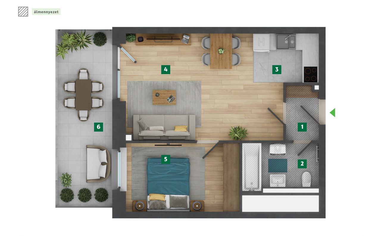 * Eladható terület definíciója: a lakás eladható területe – a kiviteli terv szerint - a lakás helyiségeinek a vakolatlan, burkolatlan falak, illetve pillérek között 1 méter magasságban mért távolság alapul vételével meghatározott (az egy méter magasság alatt található előtétfalak területét és a mögöttük lévő területet, az ajtók és szabad nyílások alatti részeket, az erkély/terasz ajtóknál lévő falkávákba benyúló, valamint az 1,90 m alatti területeket is tartalmazó) területei alapján került meghatározásra. Az eladható területbe az egy méter feletti előtétfal mögötti részek nem kerültek beszámításra. Az erkély/terasz esetében az erkély/terasz ajtó külső síkjától a burkolat széléig számított, vagyis a korlát alatti és azon kívüli területet is tartalmazó alapterület került figyelembevételre. ** Bruttó terület definíciója: a lakás bruttó területe – a kiviteli terv szerint - a vakolatlan, burkolatlan, pillérek, strangok nélküli lakás határoló falak és nyílászárók belső síkja által bezárt területe, melybe beleértendő az előtétfalak és a mögöttük lévő terület is (a lakás határoló falak belső síkjáig). Az erkély/terasz területszámítása megegyezik az eladható területnél feltüntetettekkel. A mérési módszerek különbözősége okán a lakás eladható és bruttó területe is el fog térni a lakás társasházi alapító okiratban, illetve az ingatlan-nyilvántartásban feltüntetett hasznos területétől, mely a társasház alapításakor hatályos vonatkozó rendelet alapján kerül meghatározásra. Ezen dokumentációban közölt információk kizárólag tájékoztató jellegűek, nem minősülnek ajánlattételnek. Az alaprajzon feltüntetett bútorok tájékoztató jellegűek, azok rajzi elhelyezése nem feltétlenül tükrözi azok jövőbeni elhelyezhetőségét, illetve nem tartozékai a lakásnak, nem képezik a vételár részét.