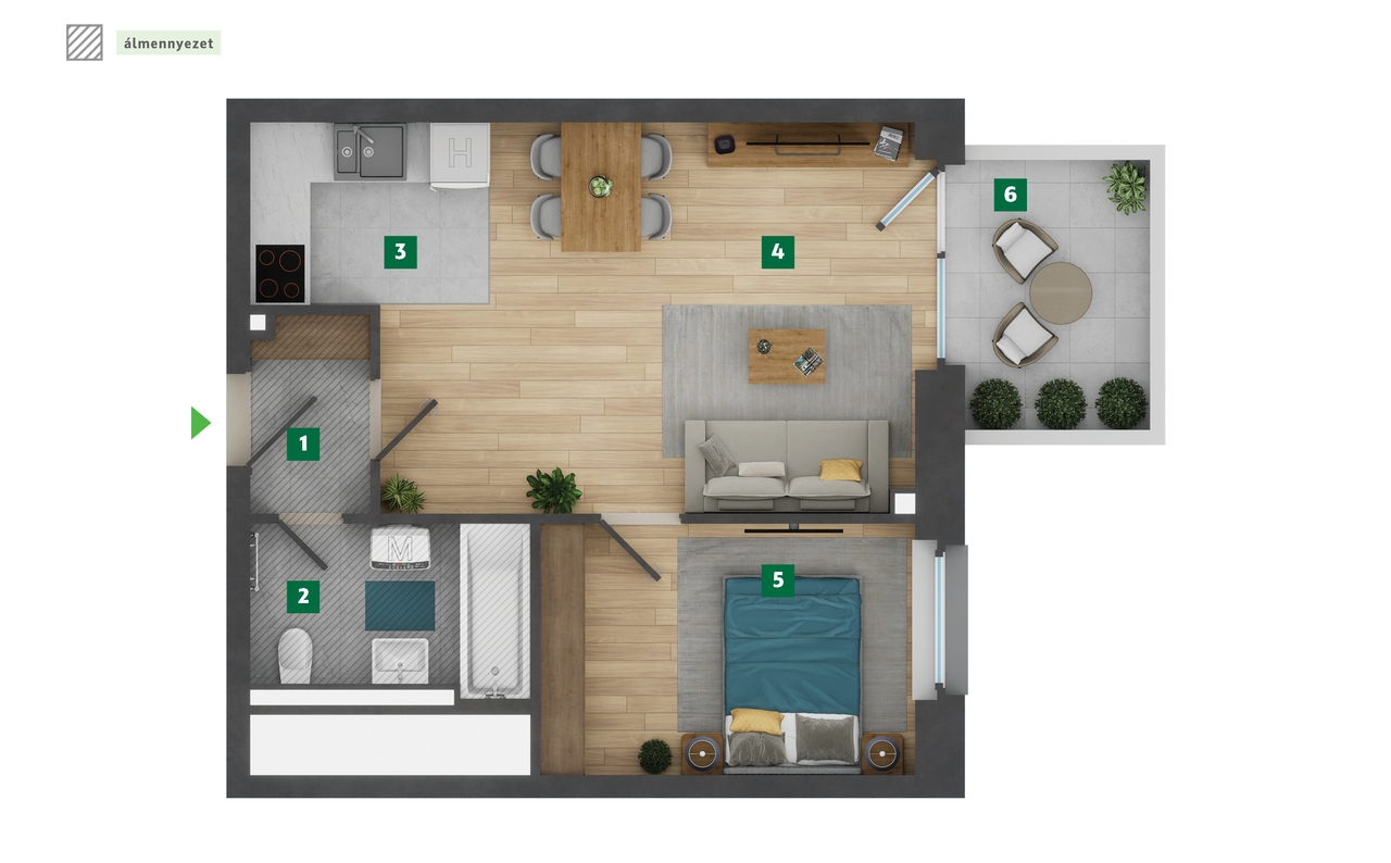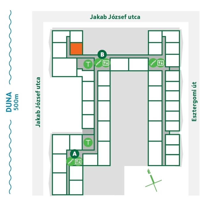 * Eladható terület definíciója: a lakás eladható területe – a kiviteli terv szerint - a lakás helyiségeinek a vakolatlan, burkolatlan falak, illetve pillérek között 1 méter magasságban mért távolság alapul vételével meghatározott (az egy méter magasság alatt található előtétfalak területét és a mögöttük lévő területet, az ajtók és szabad nyílások alatti részeket, az erkély/terasz ajtóknál lévő falkávákba benyúló, valamint az 1,90 m alatti területeket is tartalmazó) területei alapján került meghatározásra. Az eladható területbe az egy méter feletti előtétfal mögötti részek nem kerültek beszámításra. Az erkély/terasz esetében az erkély/terasz ajtó külső síkjától a burkolat széléig számított, vagyis a korlát alatti és azon kívüli területet is tartalmazó alapterület került figyelembevételre. ** Bruttó terület definíciója: a lakás bruttó területe – a kiviteli terv szerint - a vakolatlan, burkolatlan, pillérek, strangok nélküli lakás határoló falak és nyílászárók belső síkja által bezárt területe, melybe beleértendő az előtétfalak és a mögöttük lévő terület is (a lakás határoló falak belső síkjáig). Az erkély/terasz területszámítása megegyezik az eladható területnél feltüntetettekkel. A mérési módszerek különbözősége okán a lakás eladható és bruttó területe is el fog térni a lakás társasházi alapító okiratban, illetve az ingatlan-nyilvántartásban feltüntetett hasznos területétől, mely a társasház alapításakor hatályos vonatkozó rendelet alapján kerül meghatározásra. Ezen dokumentációban közölt információk kizárólag tájékoztató jellegűek, nem minősülnek ajánlattételnek. Az alaprajzon feltüntetett bútorok tájékoztató jellegűek, azok rajzi elhelyezése nem feltétlenül tükrözi azok jövőbeni elhelyezhetőségét, illetve nem tartozékai a lakásnak, nem képezik a vételár részét.